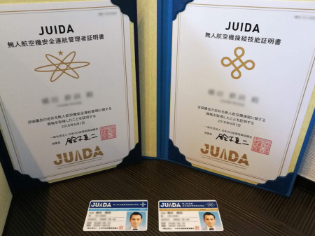 JUIDAから各種証明書の発行を希望される方は、当スクール修了試験(ドローン検定)合格後に、当スクールから発行された修了証をもって、JUIDAへの技能証明証申請手続きを行うことで各種証明書の交付を受けることができます。