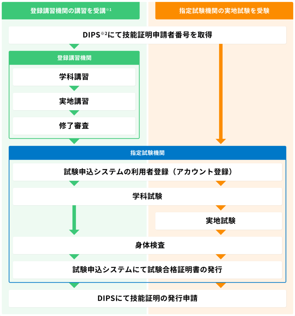 登録講習機関(スクール)で、学科・実地の講習を受け、修了審査に合格し、指定試験機関で学科の試験と身体検査に合格することで、ライセンスの取得ができます。当スクールでは登録講習機関としての、学科講習・実地講習・修了審査を行っております。
